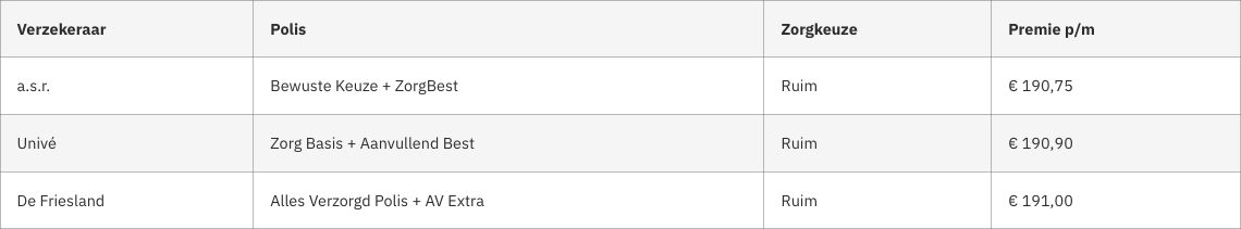 Let op: het overzicht dateert van 19 november 2025. Omdat sommige zorgverzekeraars hun premies toen nog niet hadden gepubliceerd, raden wij je aan de actuele gegevens te controleren via de zorgvergelijkingssites.