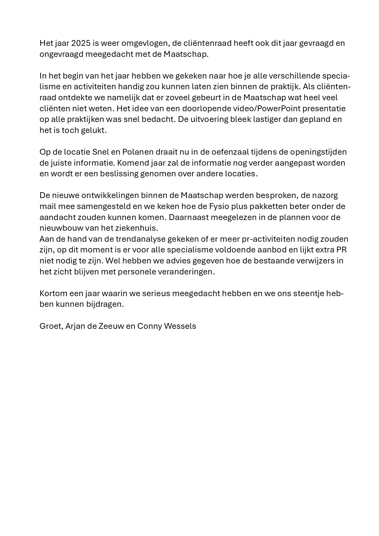In 2026 bestaat de cliëntenraad uit Conny Wessels en Arjan de Zeeuw.
