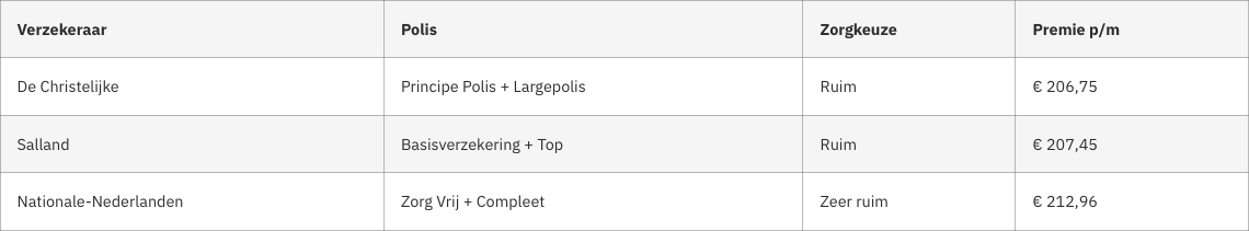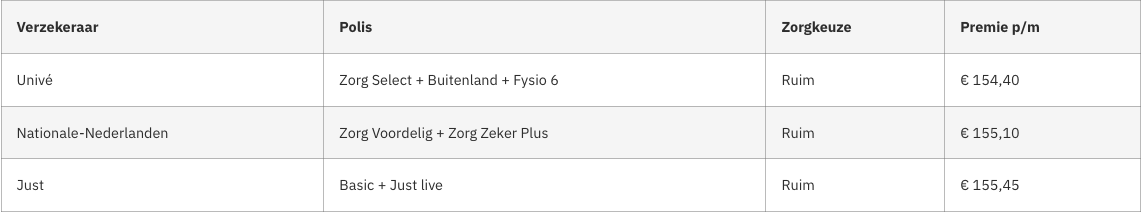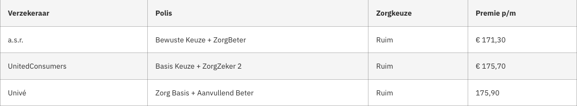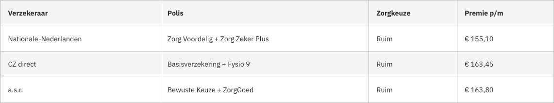Let op: het overzicht dateert van 19 november 2025. Omdat sommige zorgverzekeraars hun premies toen nog niet hadden gepubliceerd, raden wij je aan de actuele gegevens te controleren via de zorgvergelijkingssites.